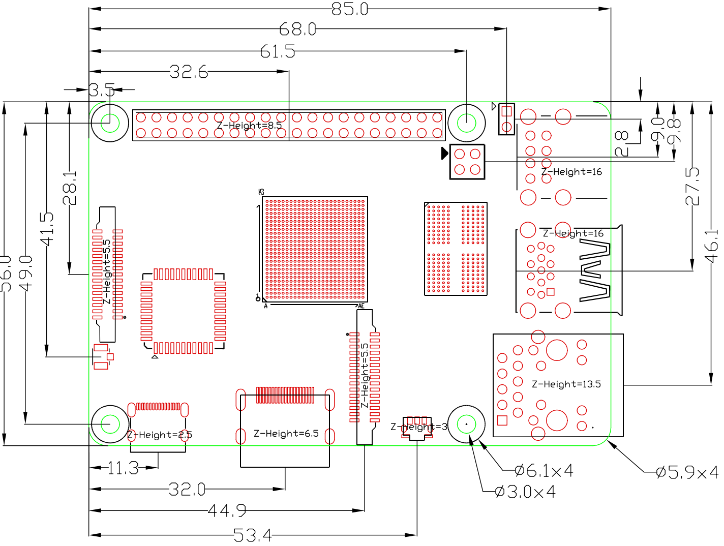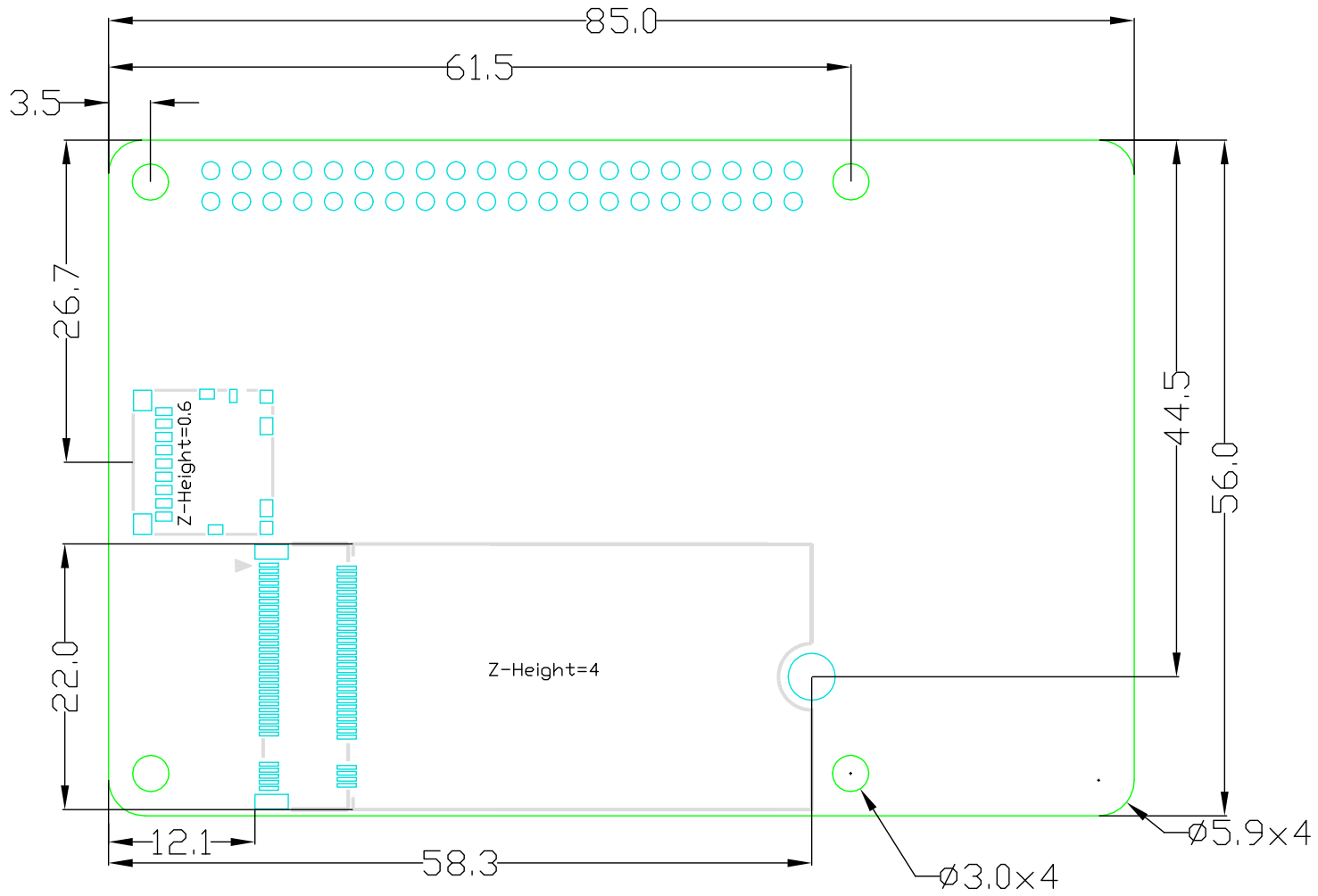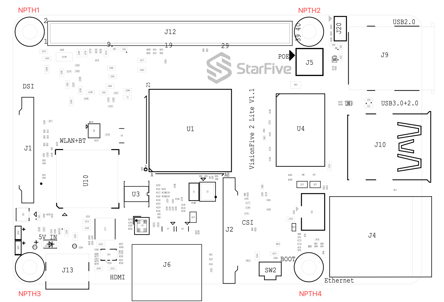 在使用VisionFive 2 Lite时,避免接触可能造成开发板损坏的硬物。因此,赛昉科技建议您为以下非沉铜孔(Non Plating Through Hole)使用隔离柱: